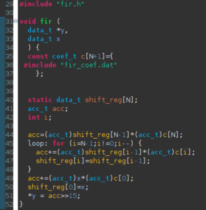 The FIR filter expects x as a sample input and pointer to the computed sample out y. Both of them are defined of data type data_t. The coefficients are loaded in array c of type coef_t from the file called fir_coef.dat located in the current directory. The sequential algorithm is applied and accumulated value (sample out) is computed in variable acc of type acc_t.