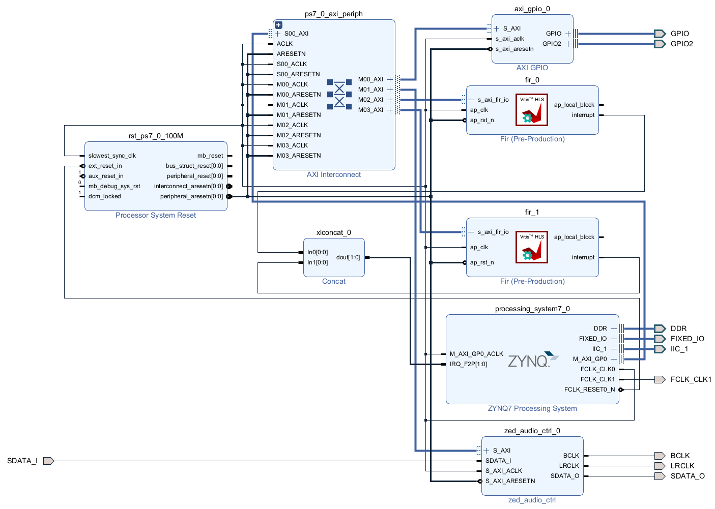 - Change the names of BCLK_0 to BCLK, LRCLK_0 to LRCLK, SDATA_O_0 to SDATA_O, SDATA_I_0 to SDATA_I, GPIO_0 to GPIO, and GPIO2_0 to GPIO2 to match the signal names useed in the provided design constraint file.