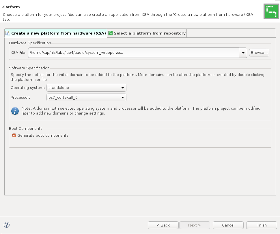 - For XSA File, browse to {labs}/lab4/audio and select system_wrapper.xsa
