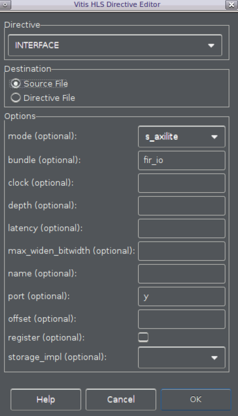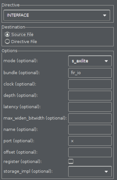 - In the Vitis HLS Directive Editor dialog box, select INTERFACE using the drop-down button.