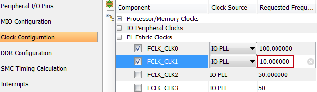 - Change the Requested Frequency value of FCLK_CLK1 to 10.000 MHz